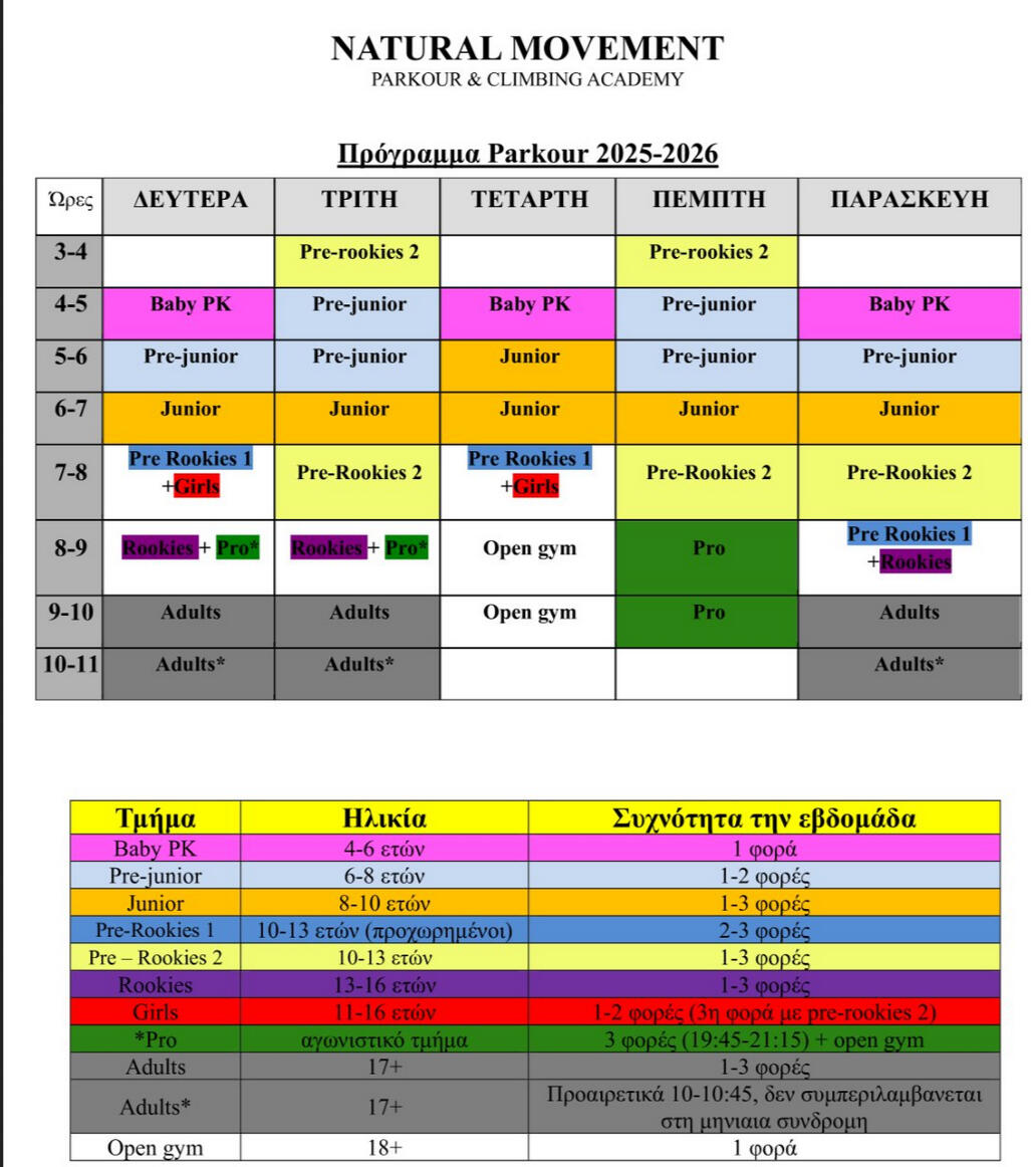 H ακαδημία Natural Movement είναι το ιδανικό μέρος για να μάθετε την τέχνη της κίνησης, να γίνετε δυνατοί, γρήγοροι και ευκίνητοι. Σκοπός μας είναι η ολιστική προσέγγιση της κίνησης με μια γκάμα από διάφορα αθλήματα-σπορ και φιλοσοφίες που περιλαμβάνουν το parkour-freerunning, την αναρρίχηση, την ακροβατική, προπόνηση δύναμης και φυσικής κατάστασης, την φυσική κίνηση, τις υπαίθριες δραστηριότητες και πολλά άλλα. Λειτουργούν τμήματα για όλες τις ηλικίες και όλα τα επίπεδα. Στην ακαδημία Διδάσκουν καθηγητές φυσικής αγωγής εξειδικευμένοι πάνω στο ανάλογο άθλημα.