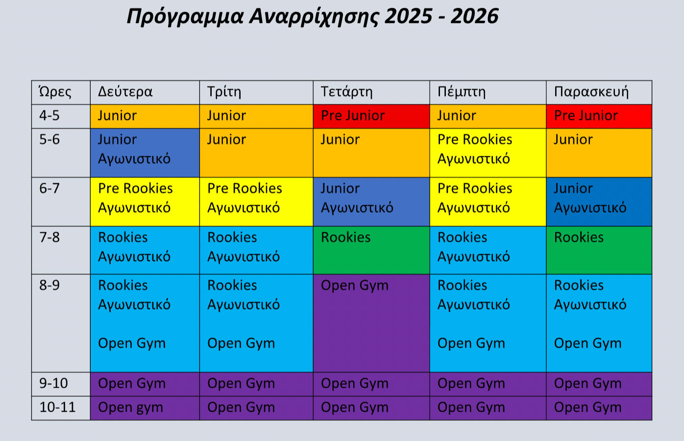 Οι εγγραφες γινονται κατοπιν συνεννόησης με τους προπονητες και δοκιμαστικης προπονησης.Οι προπονησεις ξεκινουν Δευτερα 8 Σεπτεμβρίου 2025 και οτι τα τμηματα εχουν συγκεκριμενο οριο συμμετεχοντων.